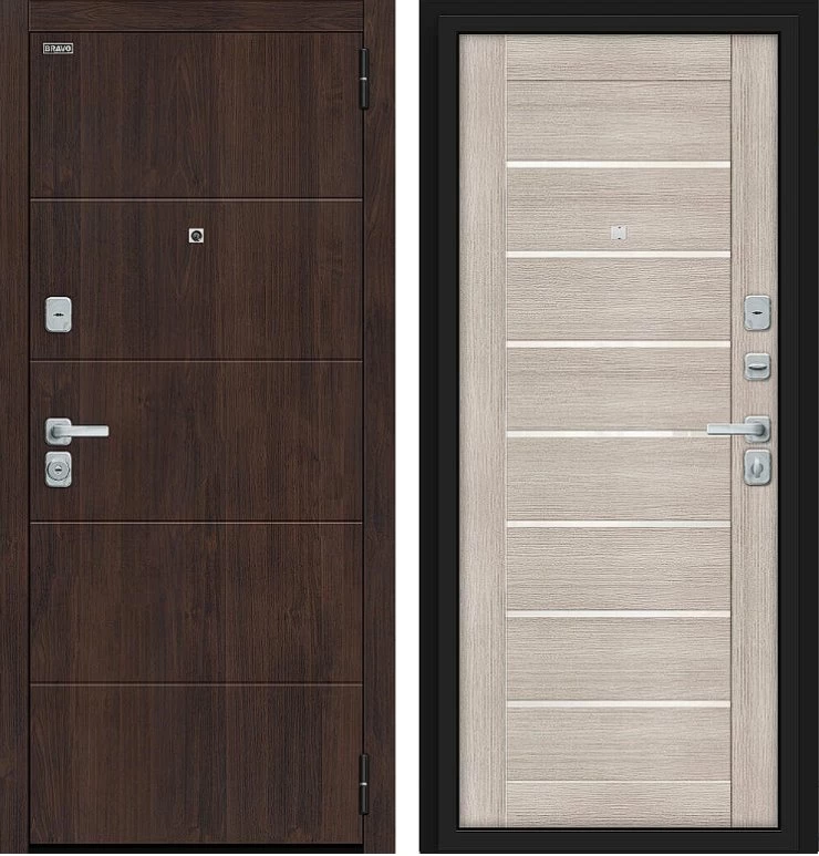 Надежная входная Дверь Браво Прайм/BChrome Almon/Cappuccino Melinga премиум класса по цене 39 945 руб. Большая толщина стали защитит от проникновения в ваш дом, квартиру или коттедж. Используется очень качественная фурнитура: замки, цилиндры, ручки, защелки. Покрытие и отделка двери изготовлено под внимательным контролем производителя. Дверь имеет долгий срок службы и гарантию.